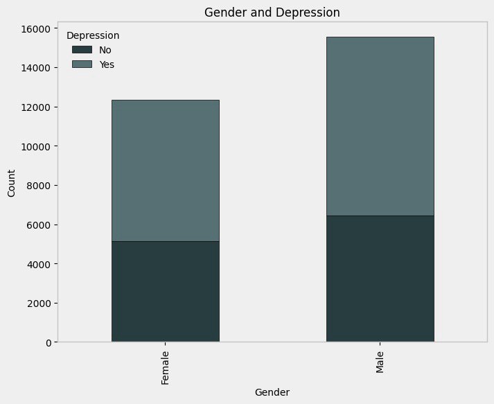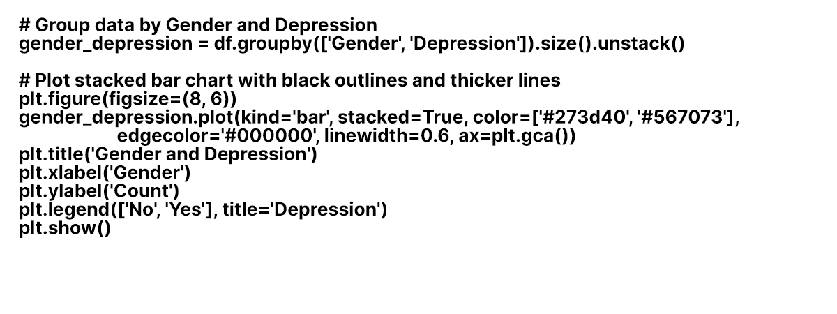 На этой диаграмме показана распространенность депрессии среди студентов мужского и женского пола. Это помогает понять, как уровень депрессии варьируется в зависимости от пола. Столбчатая диаграмма показывает количество случаев депрессии (Да/Нет) для каждого пола.