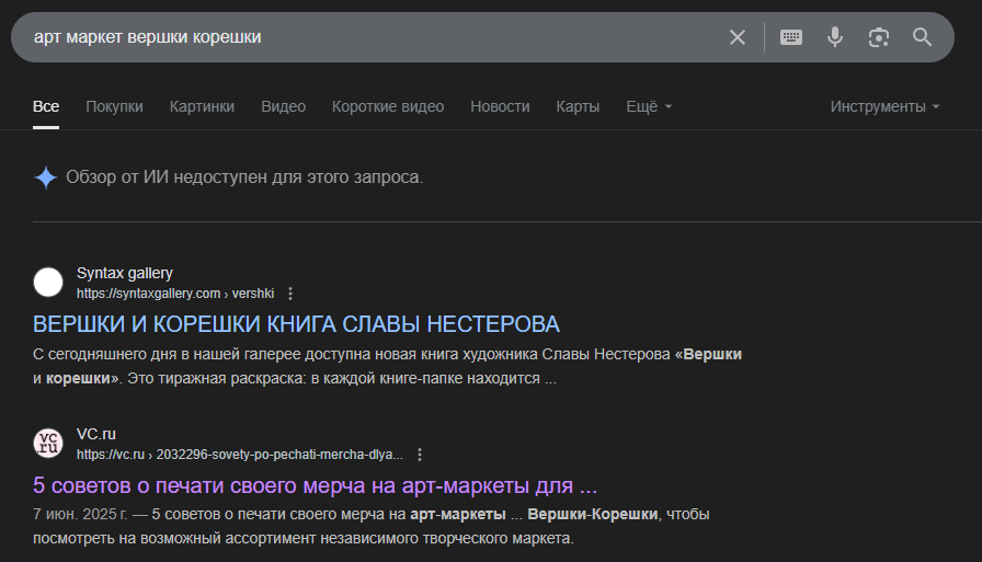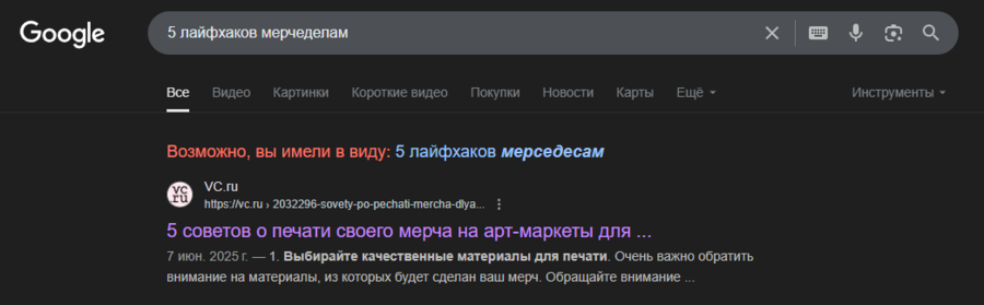Мне удалось вывести свою статью в топ даже по довольно отстранённой формулировке («лайфхаки мерчеделам»), напрямую не использованной в тексте, с помощью подбора ключевых слов с помощью нейросети, и сделать так, что запрос по названию маркета тоже выводил в топ поиска мою статью. На этом этапе было сделано два вывода — ещё раз доказал свою сложность пиар Телеграм-канала, потому что он сам не появлялся по названию в поиске, и оказалось, что под нашим названием существует ещё как минимум две похожие организации (ярмарка и маркетплейс), что заставило меня задуматься о том, чтобы дважды проверять уникальность названия при создании подобных проектов.