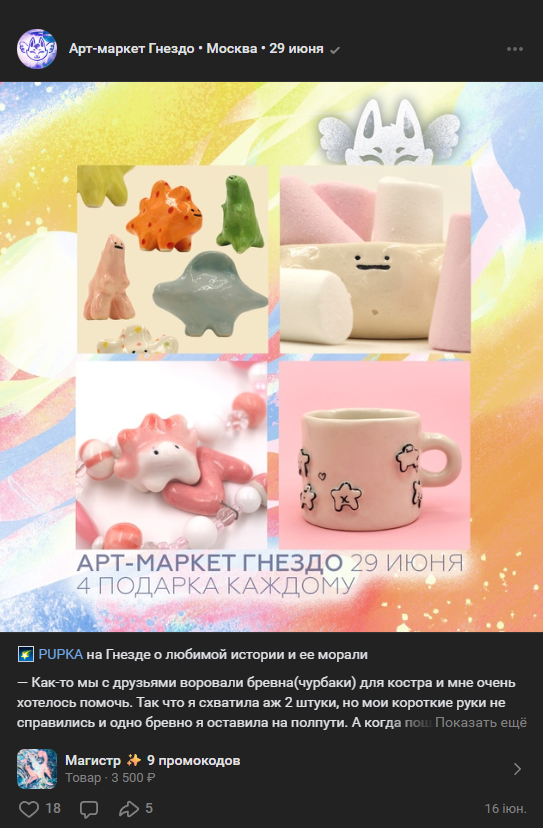 Маркет «Вершки-корешки» — мероприятие, организованное кураторкой направления комикс Марией Скаф. Это ярмарка достижений, на котором авторы направления смогут продать свой оригинальный мерч, нацеленный на заинтересованных в мелкой авторской продукции (открытки, брелоки, наклейки) и независимом искусстве людей от 16 до 35+ лет. Несмотря на то, что за продвижение была ответственна наша кураторка, обращавшаяся за рекламой в телеграмм-каналы различных издательств и блогеров, ведение отдельной социальной сети маркета было исключительно нашей, студенческой, инициативой, в которой я и ещё две моих одногруппницы стали администраторами. С их разрешения я использовал канал маркета как площадку, для которой написал статью для SEO-продвижения и сделал короткий ролик для площадки Pinterest, и в качестве проекта я приведу свои наблюдения развития канала за этот месяц.