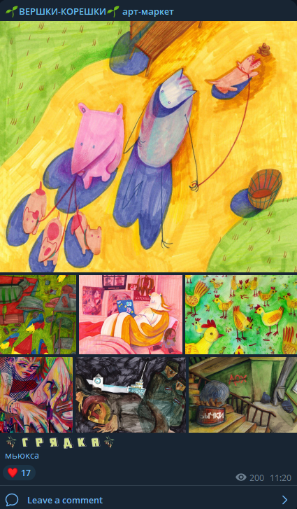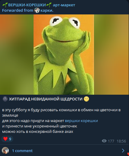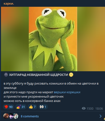 Дисбаланс в количестве реакций и то, насколько подобные проекты зависят от авторов и их аудиторий, можно пронаблюдать в собранных реакциях на посте о маркете в Телеграм-канале участницы Карки и на нашем репосте в общий канал.