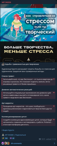 Я думаю, что если рассматривать именно посты-бэкстейджи, информационные посты, посты внутри образовательных рубрик, то можно также посмотреть на канал Art Inside — новостной канал для ТГ арт-коммьюнити.