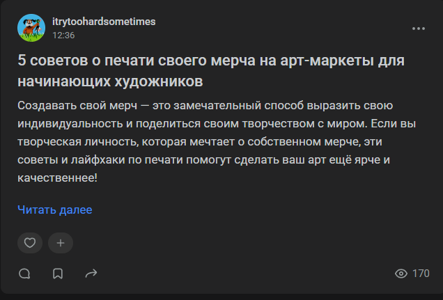 Они обычно публикуют «конспекты» видео художников, призывая посмотреть оригинал, но сразу видно, что их посты гораздо более привлекательны, чем-то, как отображается моя неразвернутая статья, даже если внутри лонгрида и есть изображения. К тому же я использовал просто картинки из интернета, а не конкретно наш продукт, что тоже было большой ошибкой.