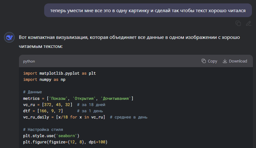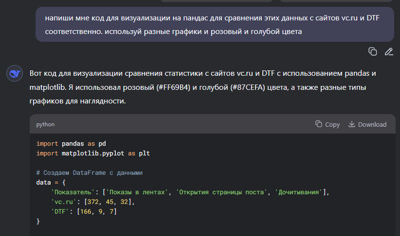 Ниже приведен дэшборд, который я сделал в Google Colab с помощью кода от Deepseek, используя промпт «напиши мне код для визуализации на пандас для сравнения этих данных с сайтов vc.ru и DTF соответственно. используй разные графики и розовый и голубой цвета» с несколькими модификациями для компактного размещения контента на картинке и небольшой редактурой текста в Photoshop для экономии времени.