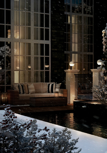 Таунхаус располагается на краю горного обрыва, где зимой перед жильцами открываются прекрасные заснеженные вершины и поля. Заказчиками дизайна таунхауса стала семья коллекционеров из Азии, которые любят посещать свой загородный дом зимой. Именно холодная атмосфера вокруг и стремление сохранить уют становятся причиной выбора теплых оттенков интерьера