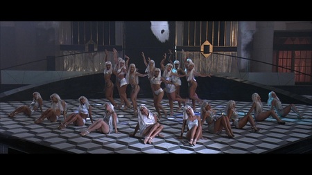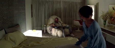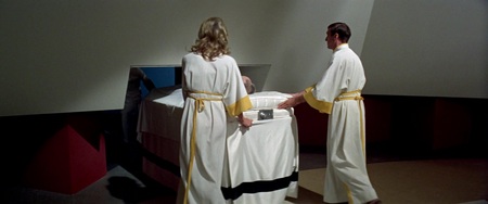 Интерьеры в фильме выполнены в стиле космической эстетики 70-х годов Америки, что отражает тогдашние представления о будущем и технологический оптимизм эпохи. Обтекаемые формы, использование современных материалов и инновационное световое оборудование, включая лайтбоксы, вмонтированные в стены, создают атмосферу передового технологического мира.