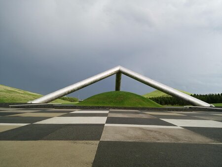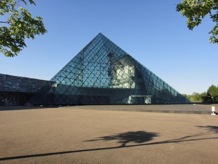 Парк Moerenuma: Стеклянная пирамида Hidamari (слева), скульптура Tetra Mound (справа). Исаму Ногучи. Саппоро, Япония, 2005