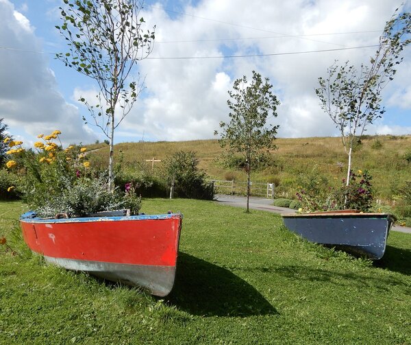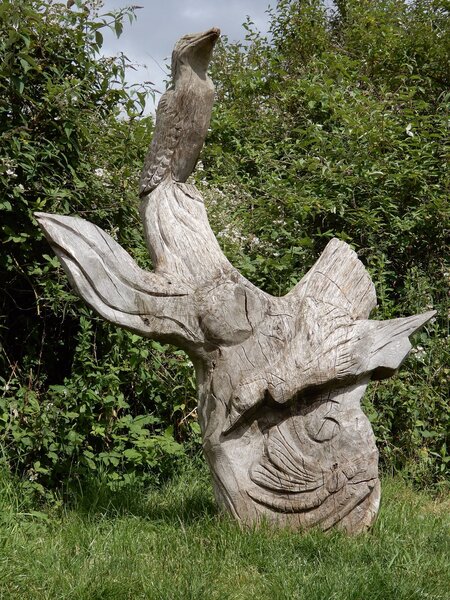 Речной парк Port Sunlight: деревянная скульптура (слева), клумбы-лодки (справа). Биркенхед, Великобритания. 2014