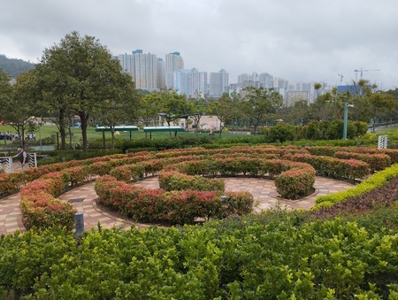Jordan Valley Park: ботанический сад (слева), прогулочная зона (справа). Гонконг, Китай. 2010