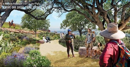 Puente Hills Landfill Park: образовательная экспедиция по лугам (слева), дубовая роща (справа). Studio-MLA. Лос-Анджелес, США. 2023 (проект)