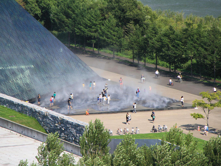 Парк Moerenuma: фонтан: скульптура (слева), гора Moere (справа). Исаму Ногучи. Саппоро, Япония, 2005