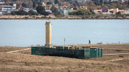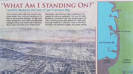 Парк Сесара Чавеса: информационный стенд «На чём я стою?» (слева), факельная установка для обезвреживания свалочного газа (справа). Беркли, США. 1997