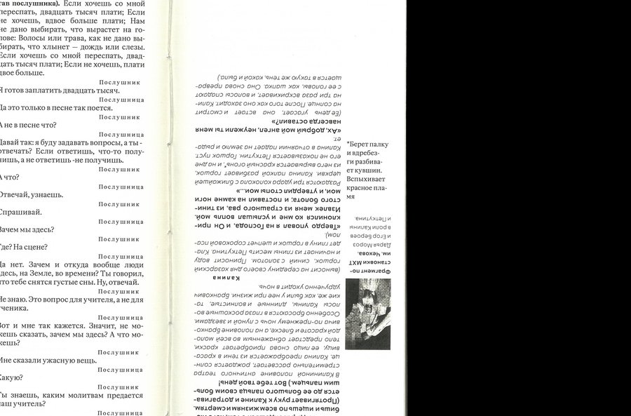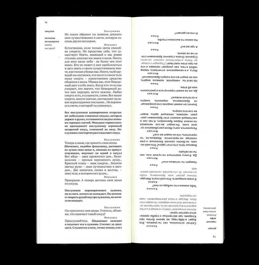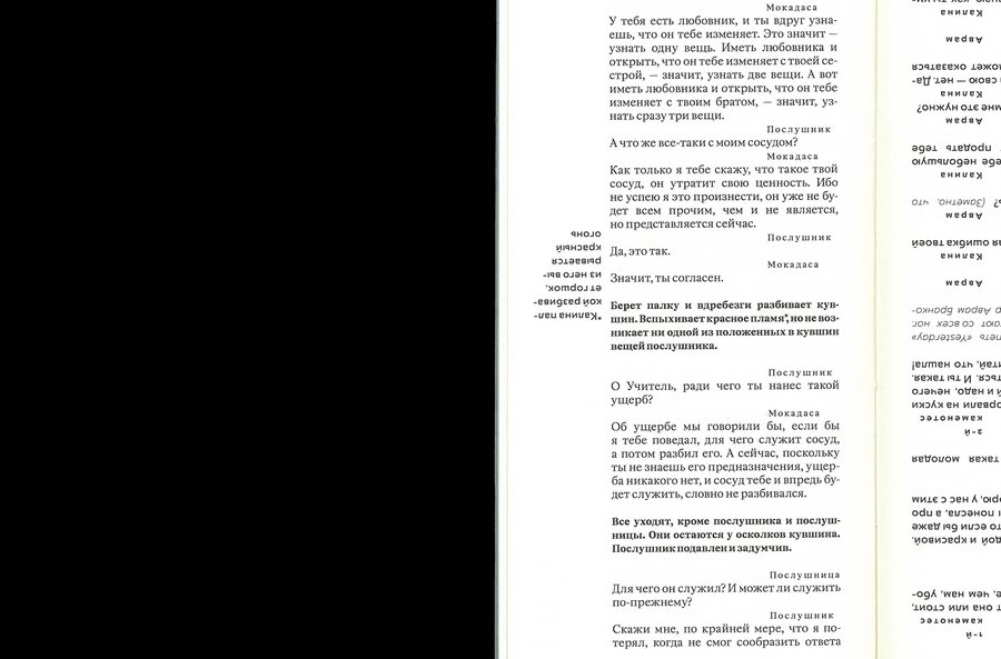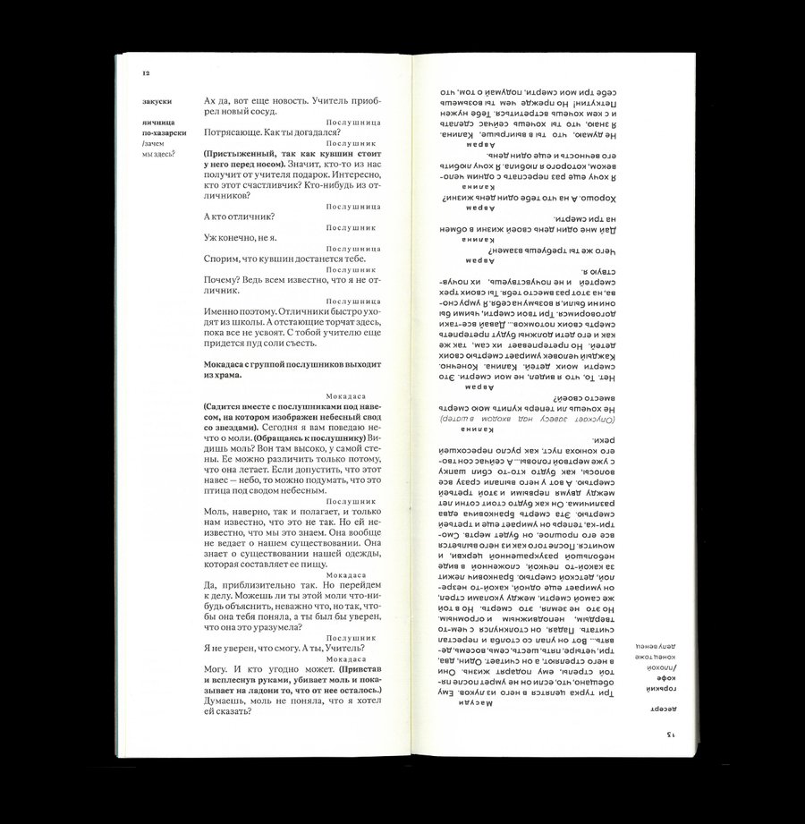 The play-hypertext constantly refers to itself in all its parts, repeating rituals, phrases, quotations. The book of links shows the type of footnotes on the side fields that are available in the direction of the part from which they appear. References work together and appear in both parts at the same time.