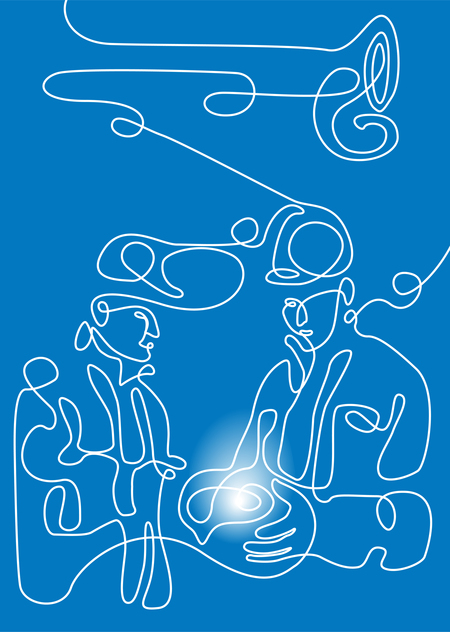 Линия символизирует связь людей друг с другом, а градиенты ассоциируются с внутренней всеобъемлющей энергией.