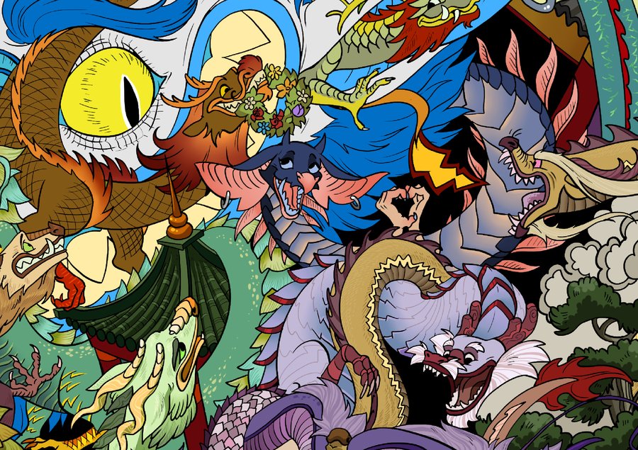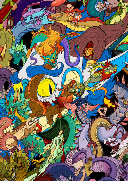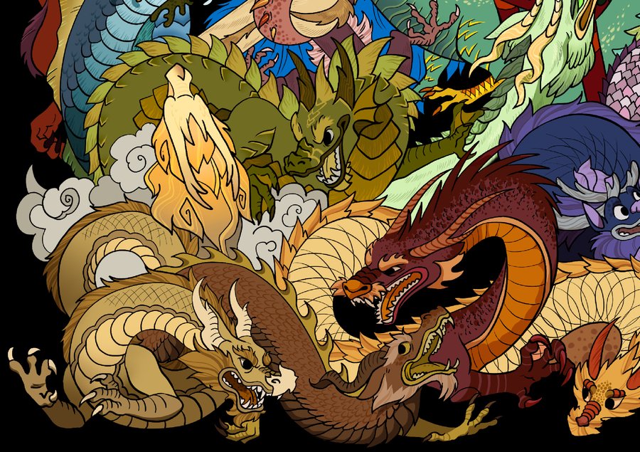 Крупногабаритная иллюстрация с большим клубком из драконов. Каждый из них чем-то заинтересован или же нет.