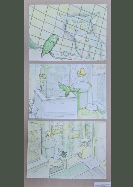 Описание: это иллюстрации по рассказу «Вот так птица попугай!». На трех изображениях представлены некоторые ключевые сцены из рассказа. Работа выполнена красками (акварелью), линерами и маркерами.