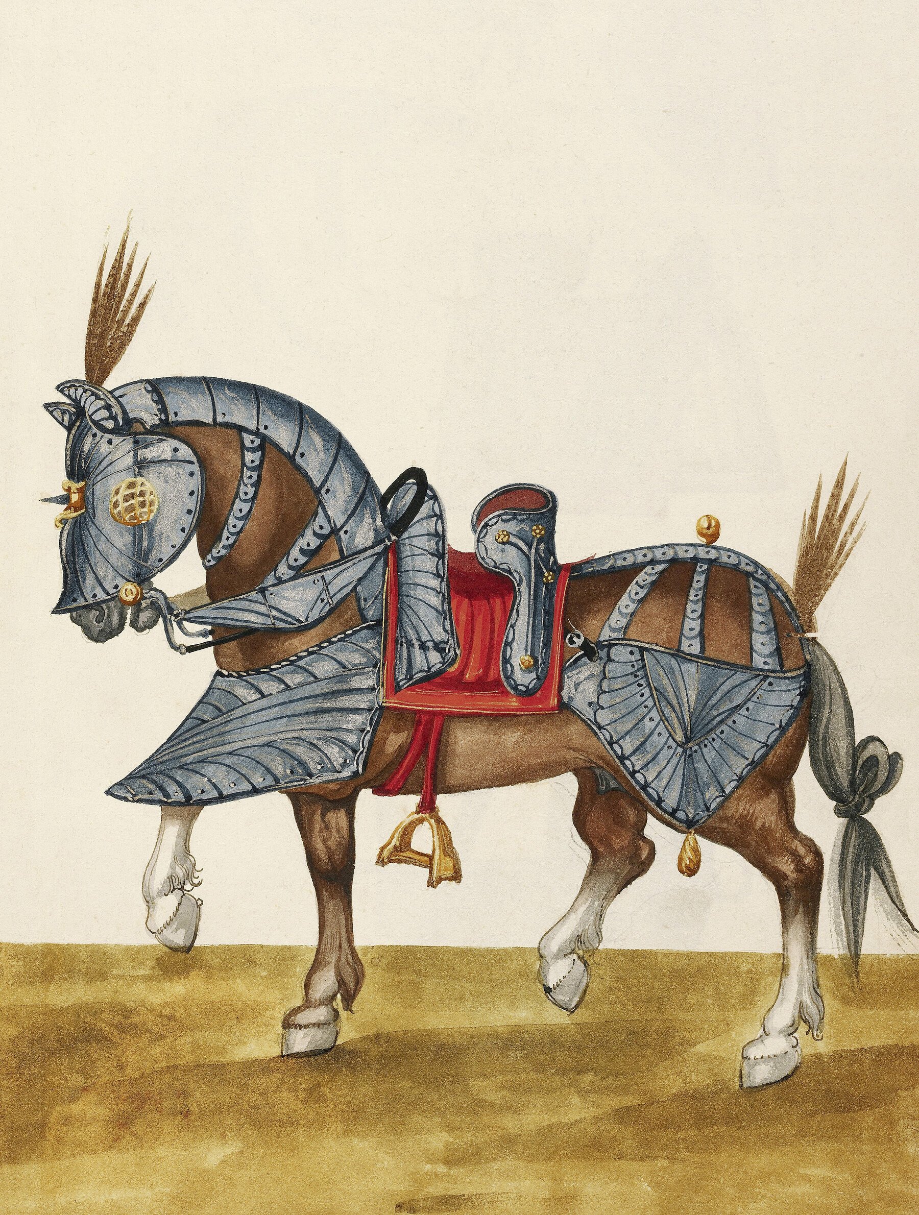 Наиболее распространённым элементом был шамфрон — металлическая маска для защиты головы, часто украшенная гравировкой или рогами. Для груди использовали крепкий нагрудник (пейтораль), а для шеи — сегментный кринет. Полный панцирь, называемый барди, применялся реже из-за веса и дороговизны. В турнирах защиту дополняли декоративные накидки с гербами. К началу Нового времени конские доспехи вышли из употребления, уступив место лёгкой кавалерии.