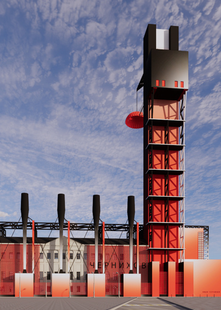 The architectural facade is designed for one of Yakov Chernykov’s works, which combines the architectural elements of the simplest type of volume into a factory-type building with a two-colored, flat-colored building with a «no-no» wash. The Chernykov factory, which is a parachute tower, hides the A. V. Schusev Museum of Architecture, thus allowing the first half of the 20 to enter the atmosphere.