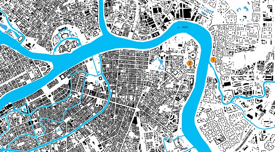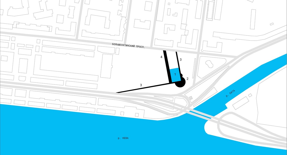 (1) Место проектирования, (2) Смольный собор; 1. Музей, 2. Площадь, 3. Пешеходные пути, 4. Подъезд