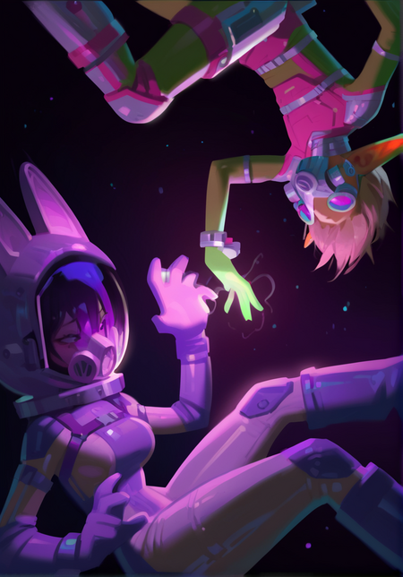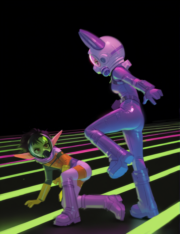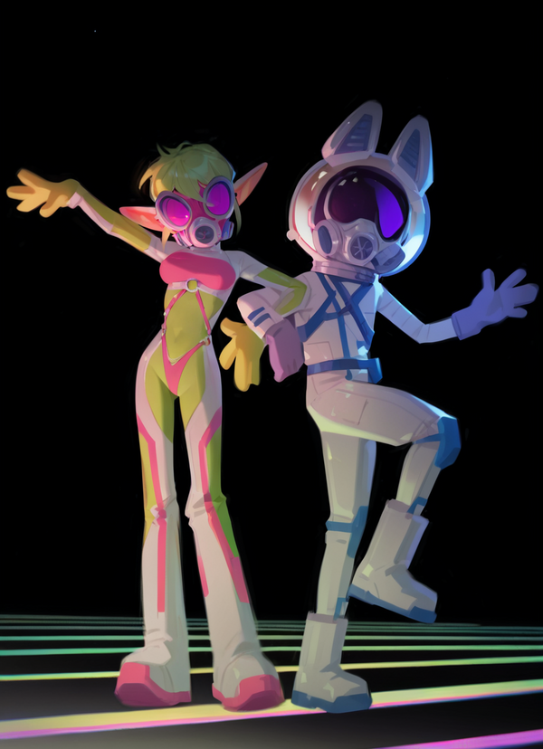 Промпт: 2 girl. green. elf. with gas mask. space helmet with ears. fimolet leather. retropunk. latex. cartoon style