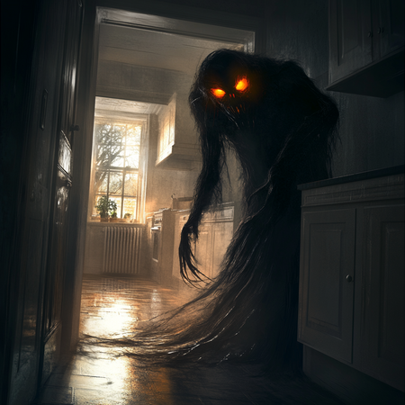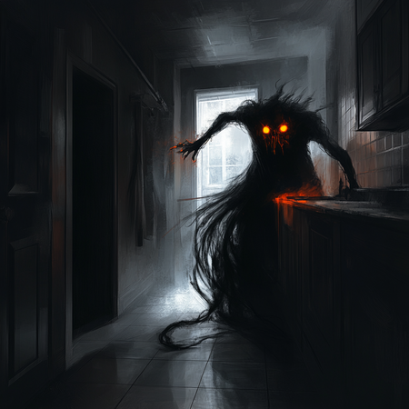 Промпт: Giant demonic creatures of darkness with orange eyes hiding in the kitchen hallway at night, dark, subdued, dynamic. Realistic, Movie, Horror.