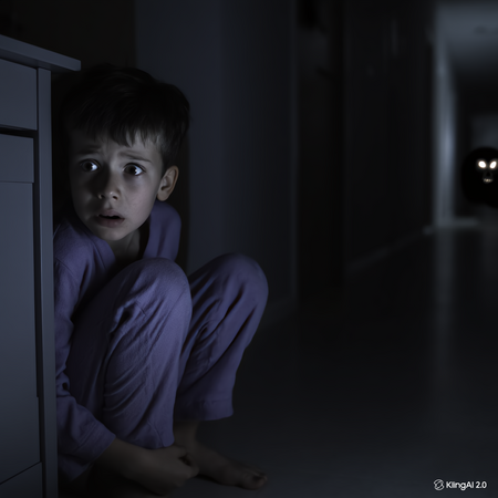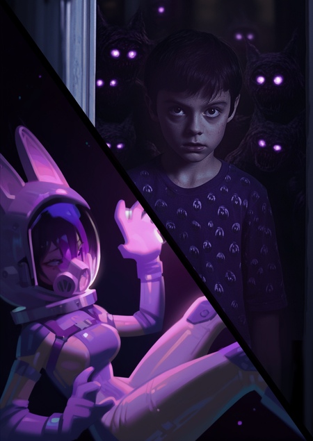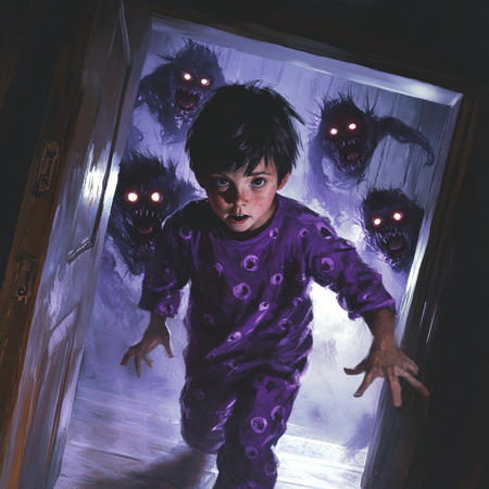 A boy with dark hair and purple pajamas turns on the light in a dark room, making monsters with glowing eyes retreat into the darkness. Realistic, Movie, Horror.