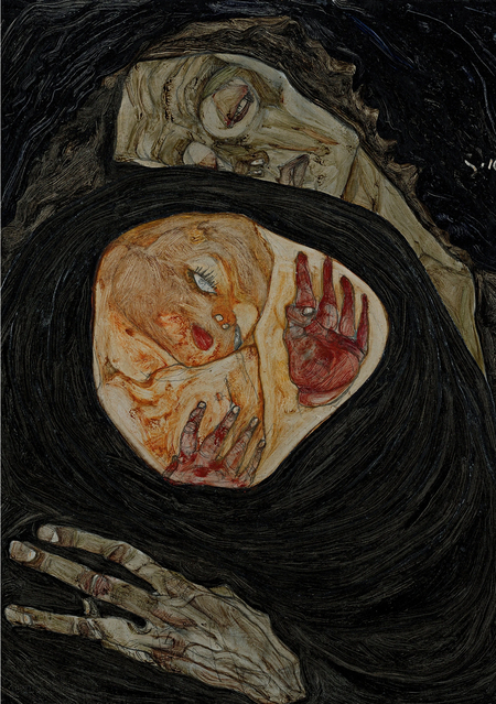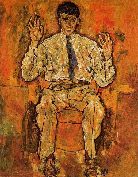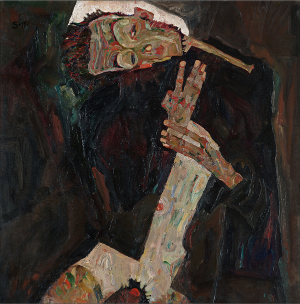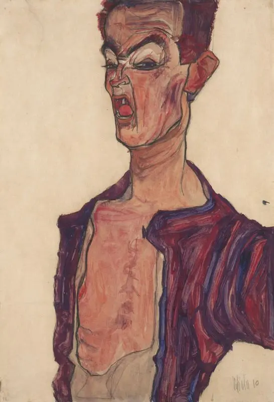 В «Обнажённый автопортрет. Гримаса» (1910) Эгона Шиле земляные тона кожи, густые пурпурные пятна и болезненно-синие тени на лице создают образ не человека, а исповеди, выплеснутой на холст. [6]