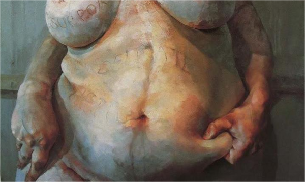 У Дженни Савилл тело становится ареной травмы. В картине «Клеймённая» женское тело испещрено следами — синяками, растяжками, воспалениями. Художница не боится уродства, и именно цвет помогает ей говорить на тему женской телесности и давления общественных ожиданий: «Я хочу, чтобы цвет ощущался, как удар» [1]