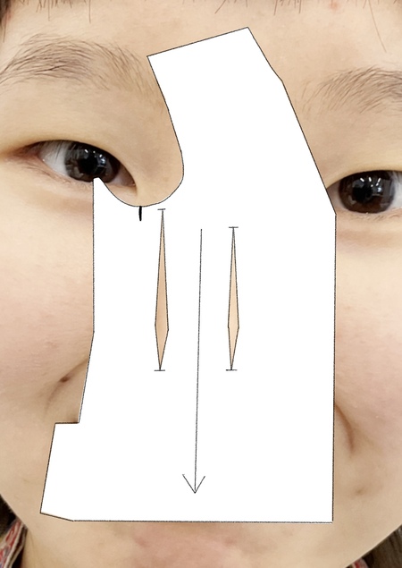 Перед с v-образным вырезом и вытачками на прилегание по линии талии и цельной боковой частью. На каждой части переда выполнен боковой прорезной карман с 2 обтачками и клапаном. На правой части переда выполнен дополнительный прорезной карман с клапаном в листочку. Борта в нижней части имеют прямую форму.