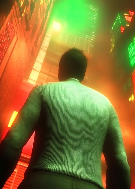 shot from the back, realistic, motion blur, double exposure, screenshot of FPS game, man in gray sweater looking up on the skyscraper, hongkong night scene, green and red light, fog --ar 9:16