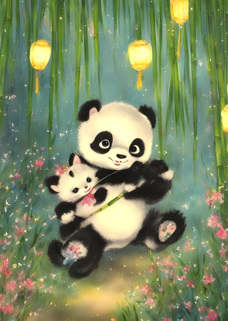 Illustration in KITTENCARD style, a baby panda wandering through a magical bamboo forest, where each bamboo stem glows faintly in the moonlight. The forest floor is covered with tiny lanterns