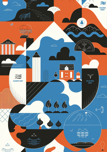 Prompt: create a simple graphic picture with an industrial pipe from which clean water flows using blue, orange, white and black colors