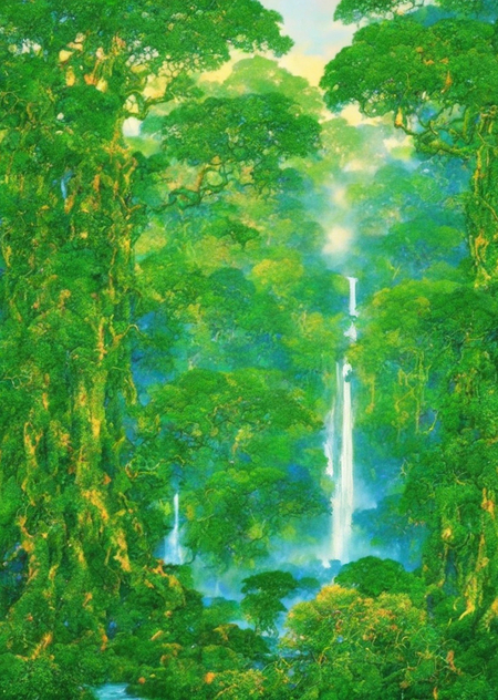in HIROO style, Lush tropical jungle with cascading waterfalls, ancient trees covered in moss, glowing mist rising from the river, golden sunlight piercing through dense foliage, soft painterly textures, magical realism