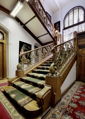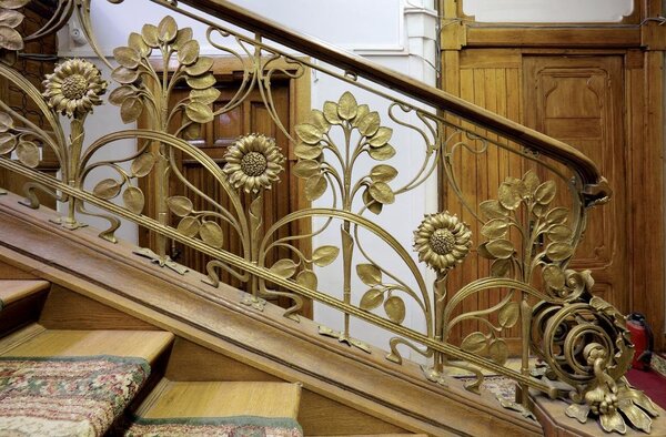 Прекрасно декорирована и парадная лестница особняка. Ее обвивают цветы подсолнуха и лунника, которые символизируют вечное течение жизни и времени, красоту солнца и празднество жизни.