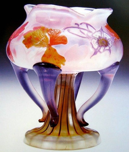 Вазы Галле из нескольких слоев цветного стекла были всегда насыщены цветочными и природными мотивами.