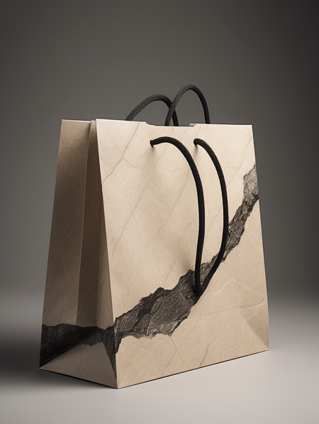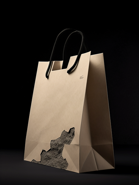 A minimalistic paper bag design for «Earthin». The bag is beige with a clean, black 'Earthin' logo printed on one side. Subtle, abstract geometric inserts resembling the shapes of stones are placed in unexpected spots, creating visual interest without overwhelming the minimal look. The overall design is sleek, luxurious, and organic, with attention to simplicity.