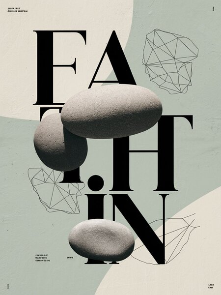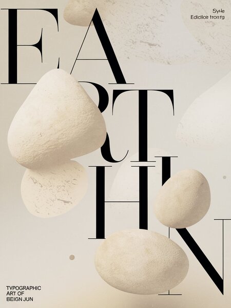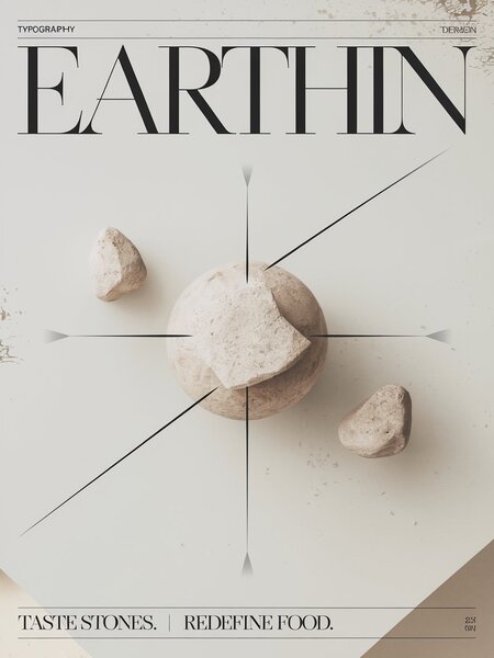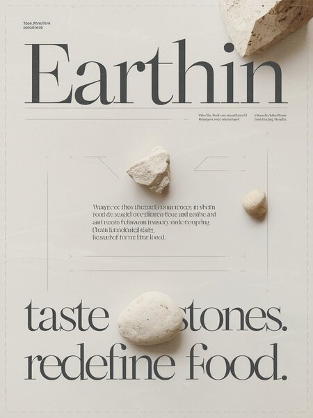 A minimalistic food textures inspired by natural stone surfaces. Smooth, polished stones are subtly blended with images of gourmet dishes on a neutral beige and grey background. The poster includes clean, modern typography with the «Earthin» and simple descriptive text. The composition is highly aesthetic, balancing white space and texture. Style: contemporary graphic design, architectural elegance, minimalism.
