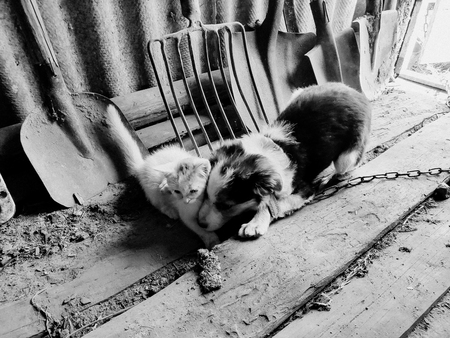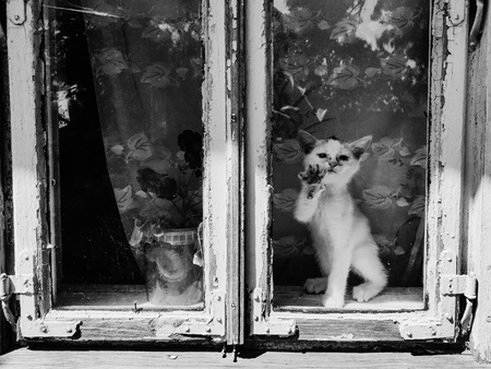 Малыш услышал шум во дворе, запрыгнул на подоконник и стучал по окну лапкой, прося о помощи. В то время как его хозяева заявили, что потеряли ключи, не желая впускать нас в дом с крадеными вещами. Дверь пришлось ломать. Котенок первым делом выбежал из дома и отправился в сарай к щенку, который сидел там на цепи, тоже голодный. Хозяева отказались их кормить, они больше были заняты рассказами о том, что похищенные вещи в дом им подкинули. Так что еду для них мне пришлось искать самому.