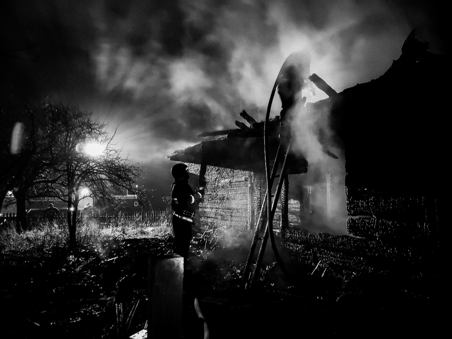 Пожарная команда борется с огнем в частном доме, хозяин злоупотреблял спиртным и погиб в пожаре. Скорее всего уснул с зажженной сигаретой, огонь распространился по деревянному дому очень быстро и дошел до кухни, где находились баллоны с бытовым газом. Пожарных вызвали соседи, когда было уже слишком поздно.