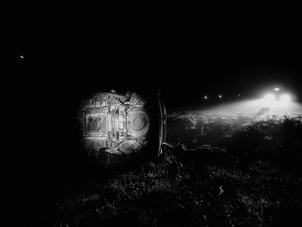 Перевернутый автомобиль, попавший в аварию в тумане из-за превышения скорости и алкоголя в крови водителя. Дорога на этом участке извилистая, ограничителей и освещения нет. Все, кто находился в машине, погибли.