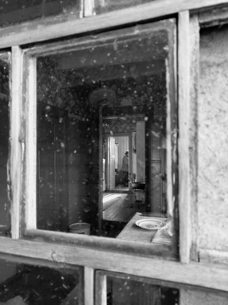 Окно деревенского дома, на пыльном столе неровно стоит открытая несколько лет назад банка варенья и куча коробок с лекарствами. За грязным окном ряды частоколов.