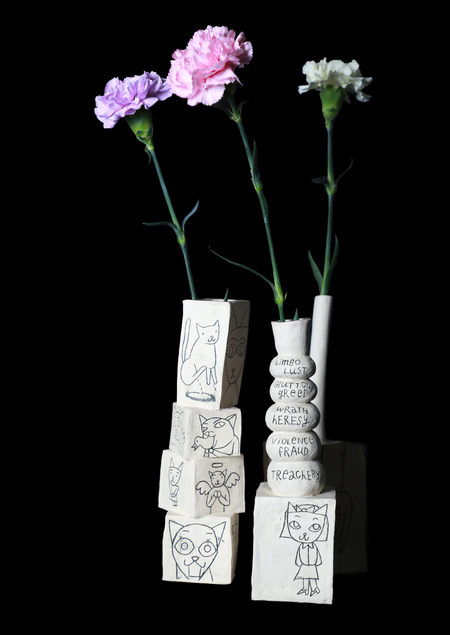 «У кошки девять жизней. Три жизни она играет, три бродяжничает и последние три остается на месте». Серия из трех керамических ваз с изображением наиболее ярких моментов столь долгих кошачьих скитаний по нашему бренному миру.