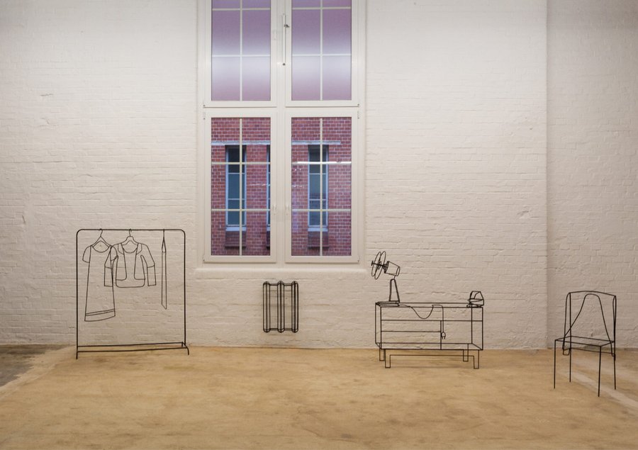 Экспозиция аскетична. Одни прожекторы выделяют скульптуры по периметру, подчеркивая их объем и фактуру, моделируя их предметность и телесность, в то время как другие заполняют пространство мерцающим светом. Тени от объектов, напоминающие по форме то слезы, то строительную арматуру, то кольца, падают на стены, визуально отсылая к «объемной графике» и сохраняя преемственность с пластическим языком художницы.
