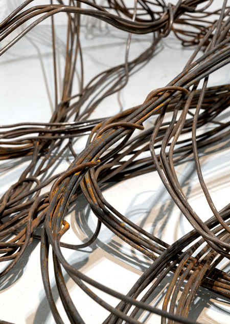 Прутья-провода, размещенные на стенах в зале и сваленные в углу, — тяжелые и грубые. Возможно, они пролежат здесь еще долго, до тех пор, пока не сложатся новые связи, пока провода не спрячутся обратно в стены, а сбои системы не исправятся. Любопытна на выставке мысль о том, что как только с инфраструктурой, организующей бесперебойную работу, происходят дефекты, человек начинает сразу же замечать всю технологическую сеть, выталкивая себя из рутиной слепоты в пространство повышенной осознанности.