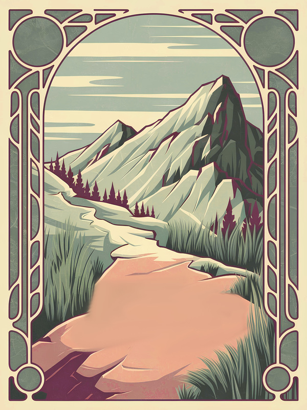 Промпт 5: Create a poster mockup for the brand of sports sunglasses Soleil in the style of Art Nouveau, use natural colors light beige, cool green and burgundy, the theme should be related to hiking, sports glasses, mountains --sref https://i.postimg.cc/kgLWdw54/IMG-7581.jpg https://i.postimg.cc/HsZQ6TDb/IMG-7582.jpg