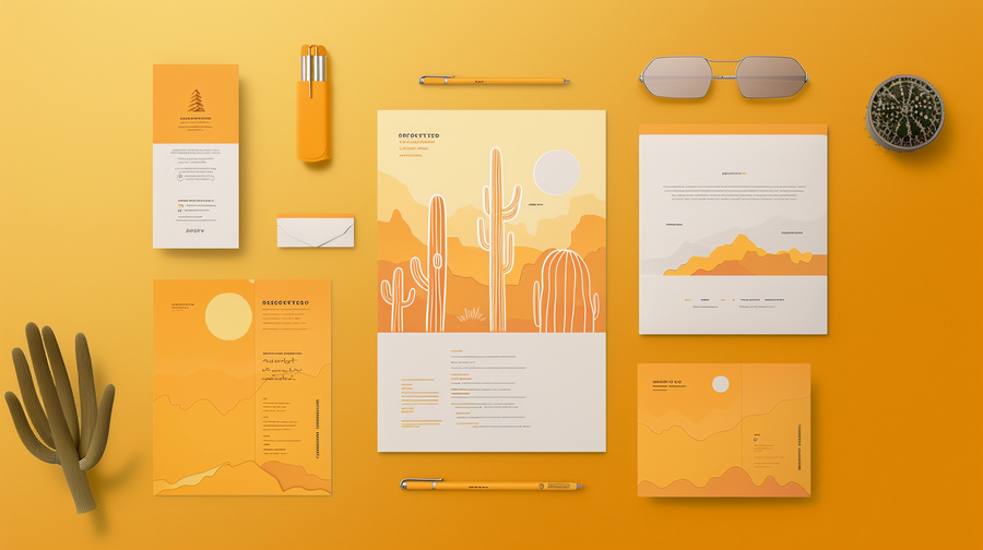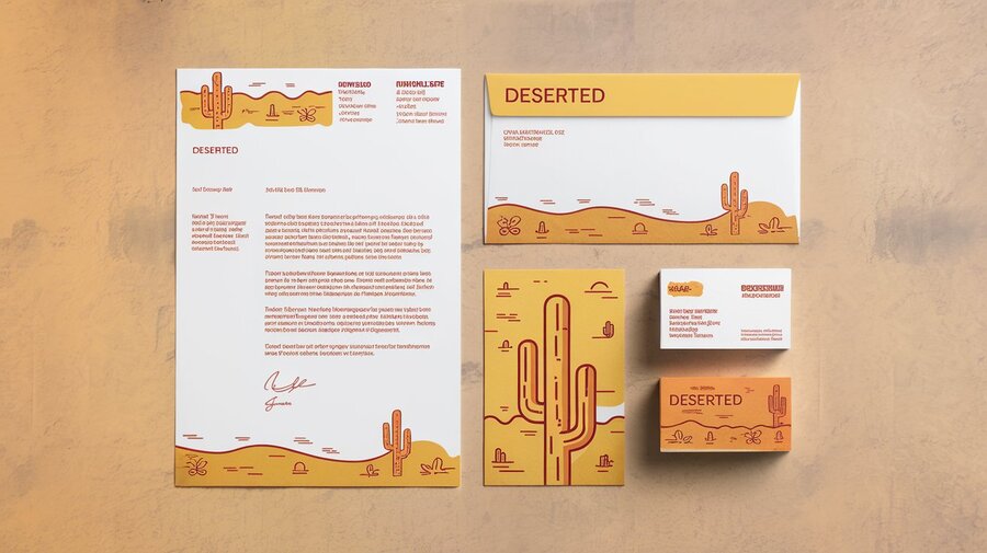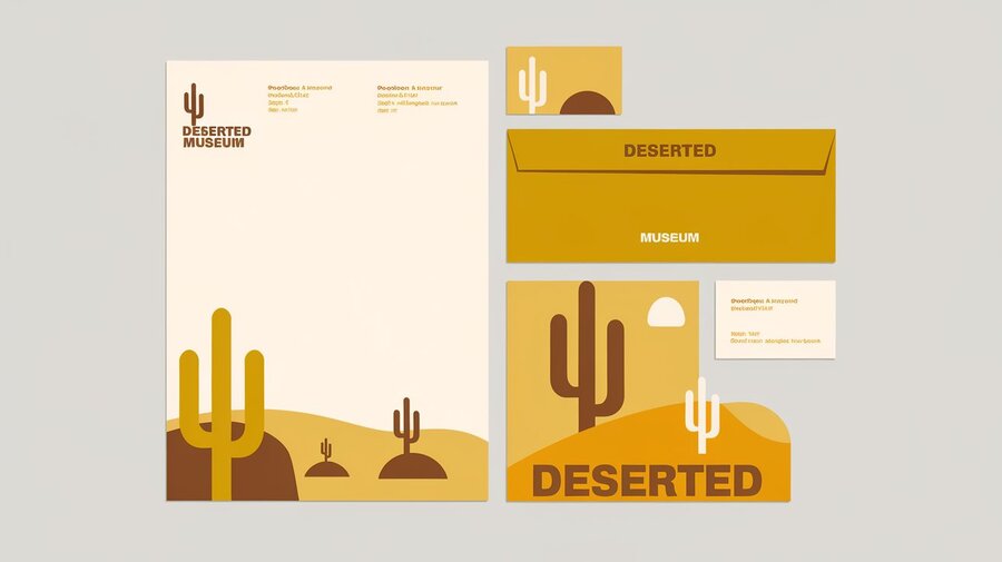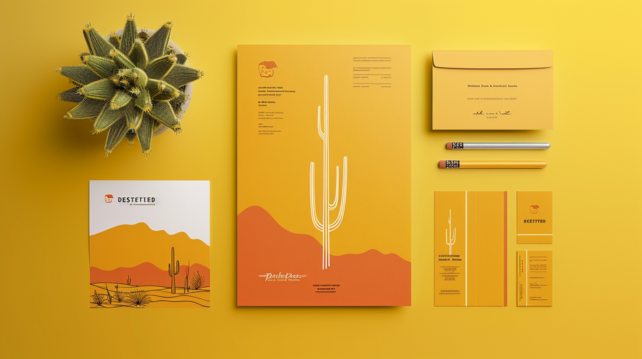 /imagine prompt: create a layout of branded printed materials (letterhead envelope, business card) for the DESERTED Desert Museum, top view, made from a yellow-orange color palette using minimalistic vector illustrations of cacti, sand, need the word DESERTED to be printed --ar 16:9 --v 6.0