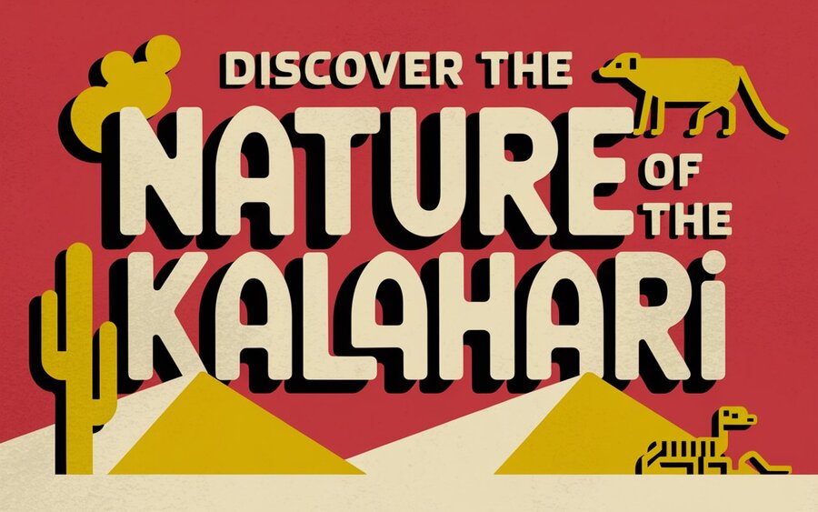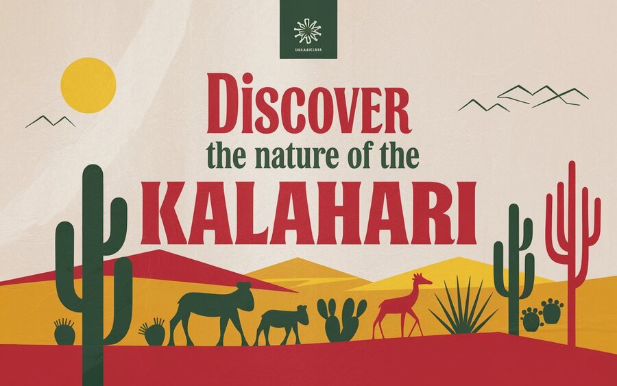 /imagine prompt: make an advertising poster for the DESERTED desert museum, advertising the museum itself, there should be an inscription «Discover the nature of the Kalahari», there should be sands, cacti, animals of the Kalahari desert, the paper for the poster should be textured, bright colors, red, beige, yellow, in a modern design style