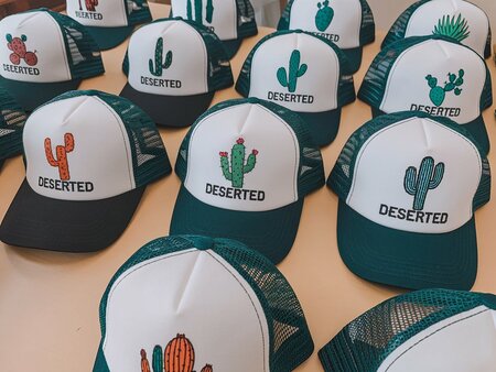 (кепка) /imagine prompt: make caps, they should have different cactus designs printed on them and word DESERTED