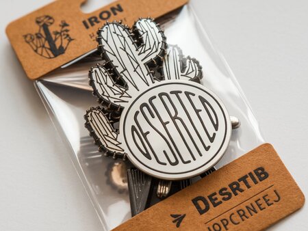(2) /imagine prompt: iron pins, in the package, must be made of metal, it is clear that this is a badge, the pins must be in the shape of cacti, and there must also be a DESERTED logo, modern style
