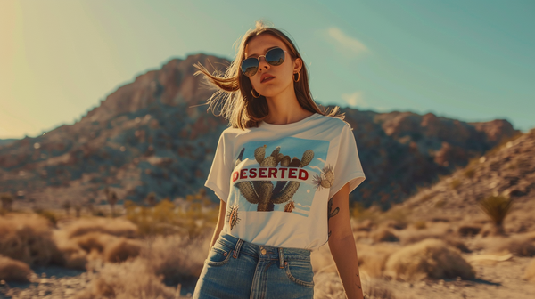 (футболка) /imagine prompt: T-shirt with a cactus and the inscription «DESERTED», T-shirt on a girl, a girl stands against the background of a desert --ar 16:9
