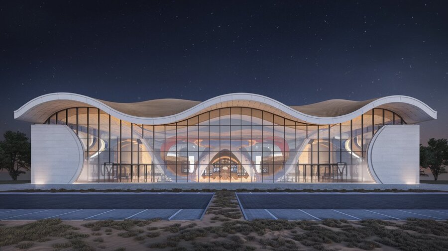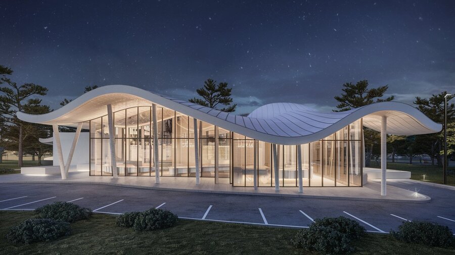 /imagine prompt: A white building with a wave-shaped roof inspired by the desert dunes, with glass windows and flowing lines. The exterior is illuminated at night, creating an atmosphere of calm and modernity. It is accessed by parking on one side. It was designed in the style of architectural visualization with high resolution and detailed renderings.